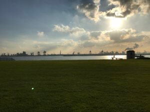 Der Platz ist für 5 Mobile am Ende eines Parkplatz ohne jegliche V/E allerdings umsonst. Man hat einen direkten Blick auf die grossen Schiffe, welche im Minutentakt vorbei fahren, davor ist eine grosse Wiese, ganz schön. Die Stadt ist auch zu Fuß zu erreichen. Wir fahren mit Tony und mara zunächst einmal zum Strand. Dort finden wir jede Menge Strandbuden und einige sind auch noch geöffnet. Wir kehren ein und essen eine Kleinigkeit.