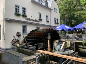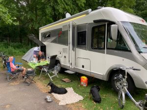 Nach dem kulturellen Teil, geht es mit den Hunden in den nächsten Ort. Das Wetter ist sehr gut, so dass wir schön an der Lahn vorbei radeln können. Der einzige Biergarten hat leider geschlossen, so sitzen wir später vor dem Womo und quatschen.