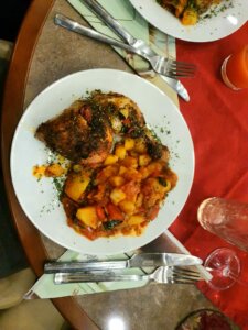 , welches während der Zubereitung durch einen perfekten Sonnenuntergang begleitet wird. Campari Orange, Vorspeise und mediterranes Hähnchen aus dem Römertopf mit Kartoffelratatouille, Espresso…… Absacker.