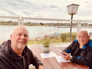 Jetzt stehen wir frei am Restaurant Piwipp, direkt am Rhein…. Mit Biergarten und schönem Blick.