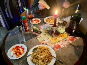 Kurzer Bummel durch die Stadt, dann gab es einen gemütlichen Abend im Hodgi, begleitet von Veggi Bolognese und Salätchen…..,immer wieder lecker.