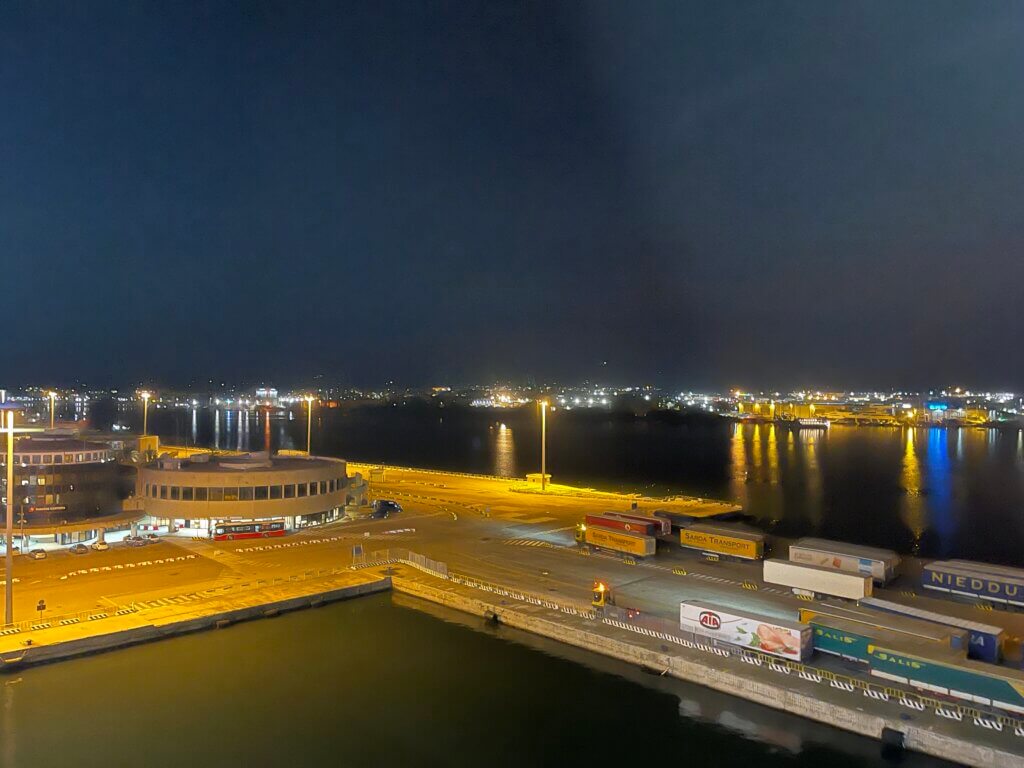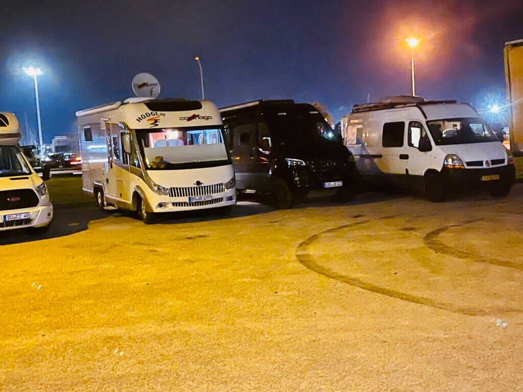 Unsere Fähre startet eine Stunde später gegen 23.30h, hoffentlich…….so stehen wir nun im Hafen. Essen und abwarten….