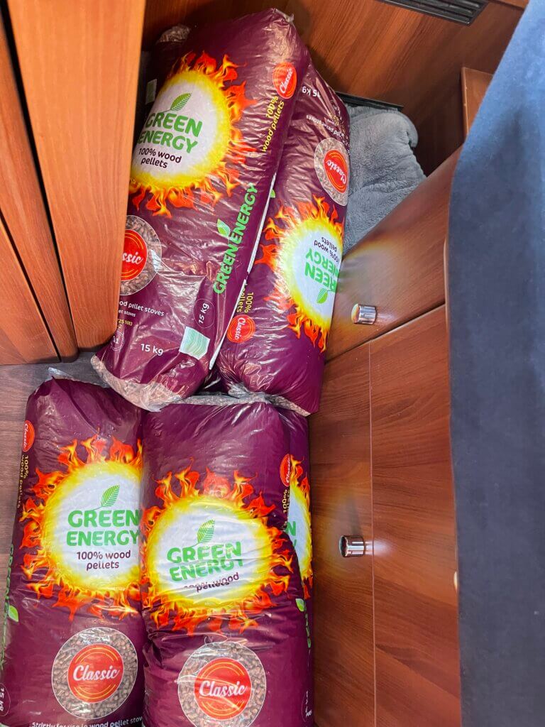 Hier kaufen wir Pellets, zu einem noch akzeptablem Preis und staunen darüber, was so alles in den Hodgi rein passt. Wir mussten tatsächlich noch den Wohnraum nutzen🤷♂️, damit wir alle Säcke unter bringen.