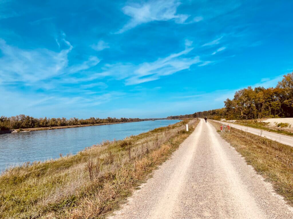 Zurück fahren wir zunächst durch die Rheinauen, doch der Weg war wirklich nicht besonders und die Sonne kam nicht durch die noch sehr dicht belaubten Baumkronen. So fuhren wir zurück an den Rheindamm.