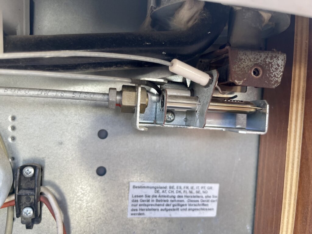 Herr Brechtel öffnet das Gitter und sagt nach ca. 20 sec. Zitat:“ kein Wunder, das ist ja der falsche Brenner für die Größe des Kühlschranks“. Dann wurde innerhalb von 15 min ein neuer, stärkerer Brenner eingebaut, denn vermutlich wurde es bereits bei Dometic bei der Herstellung verbockt! Kann wohl passieren, da hat sich der Arbeiter bei der Brennerwahl wohl vergriffen…, gibts doch nicht oder!