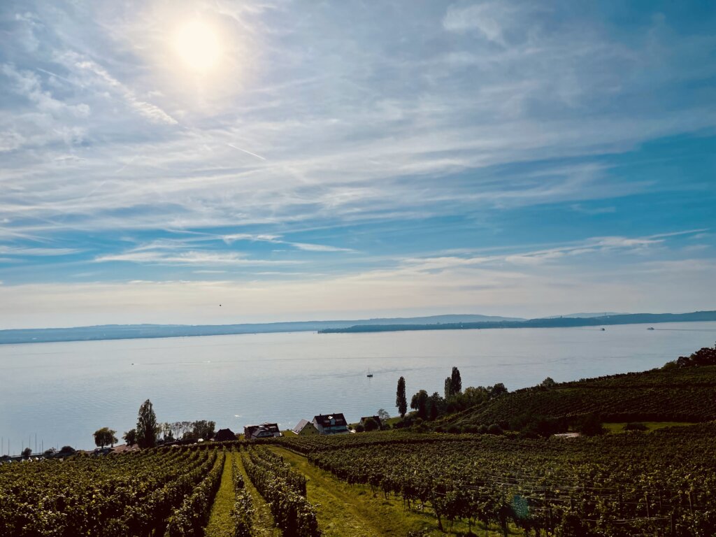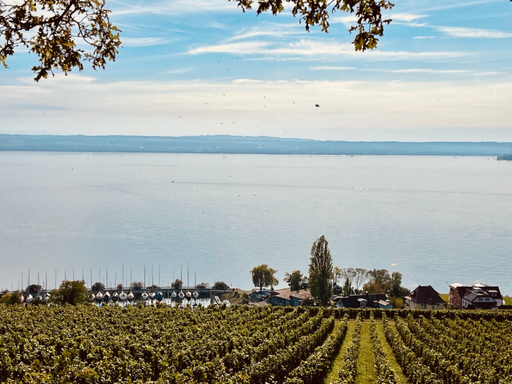 Danach fuhren wir an den Bodensee und bekamen den vorletzten Platz in Stetten, ein schöner Stellplatz. Kurzes Radtürchen mit Stop in einer Winzerstube, mitten in den Weinbergen und schönen Blick auf den See.