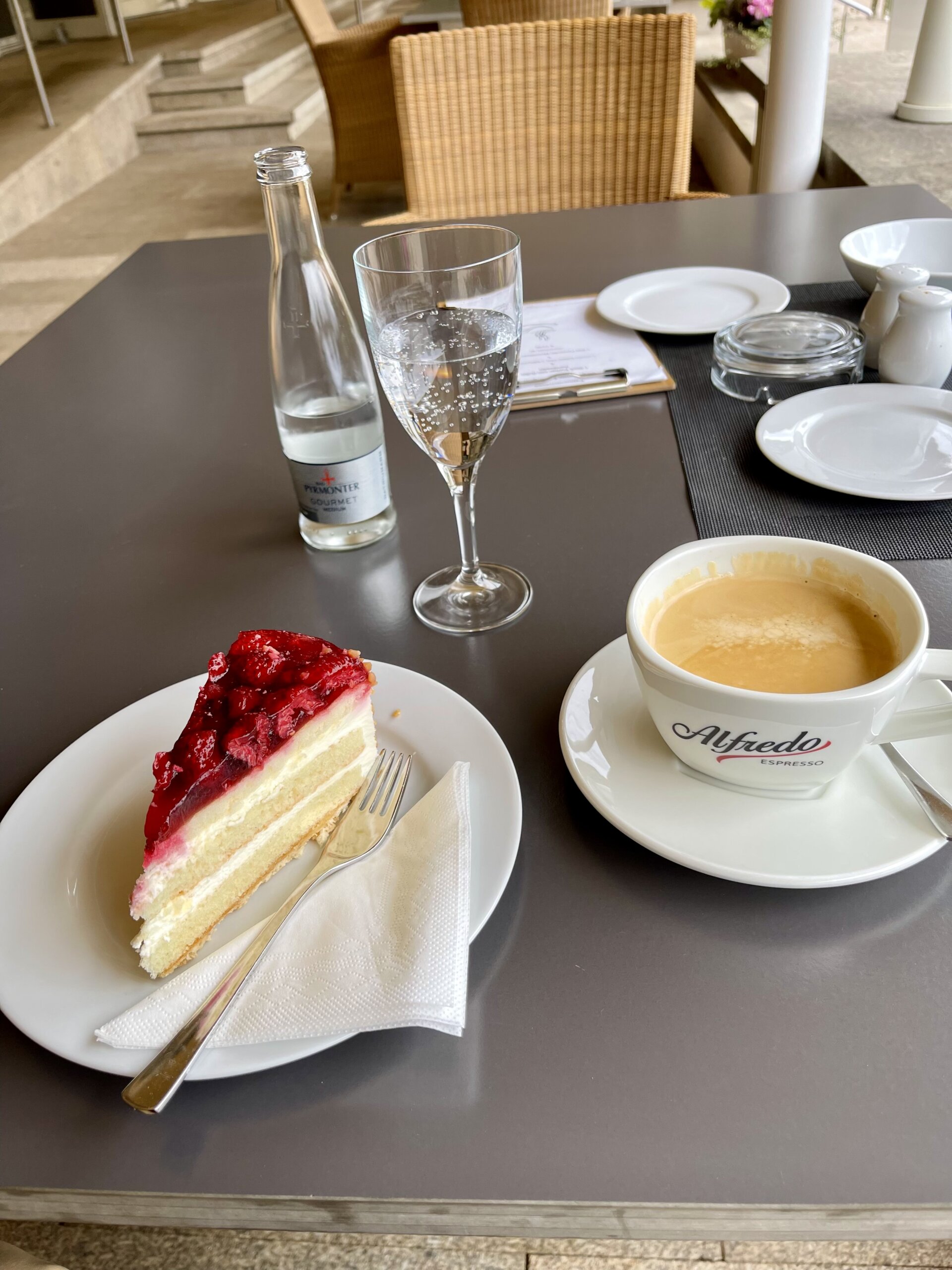 Für mich war dann mal eine Kafffeepause angesagt auf der Terasse des Steignberger Hotels im Kurpark. Hier warte ich bei einem leckeren Himbeerkuchen, zu einem total günstigen Preis auf Dirk.