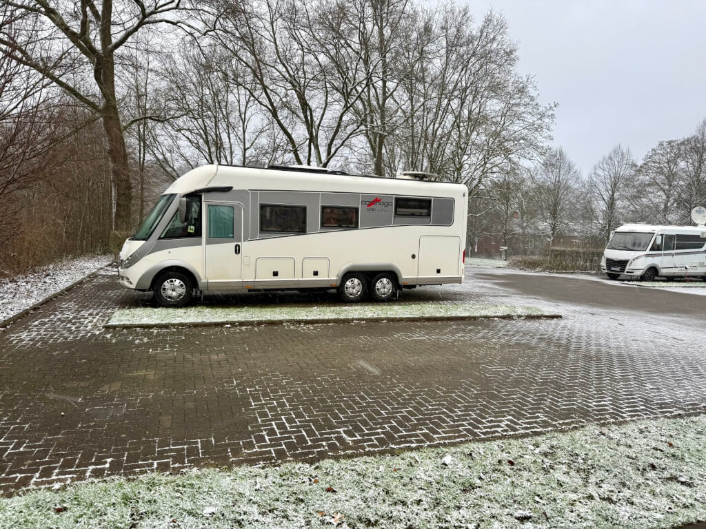 Am offiziellen Stellplatz in Bielefeld, welcher im Winter kostenlos ist, da es keine V/ E gibt, schneit es stark.