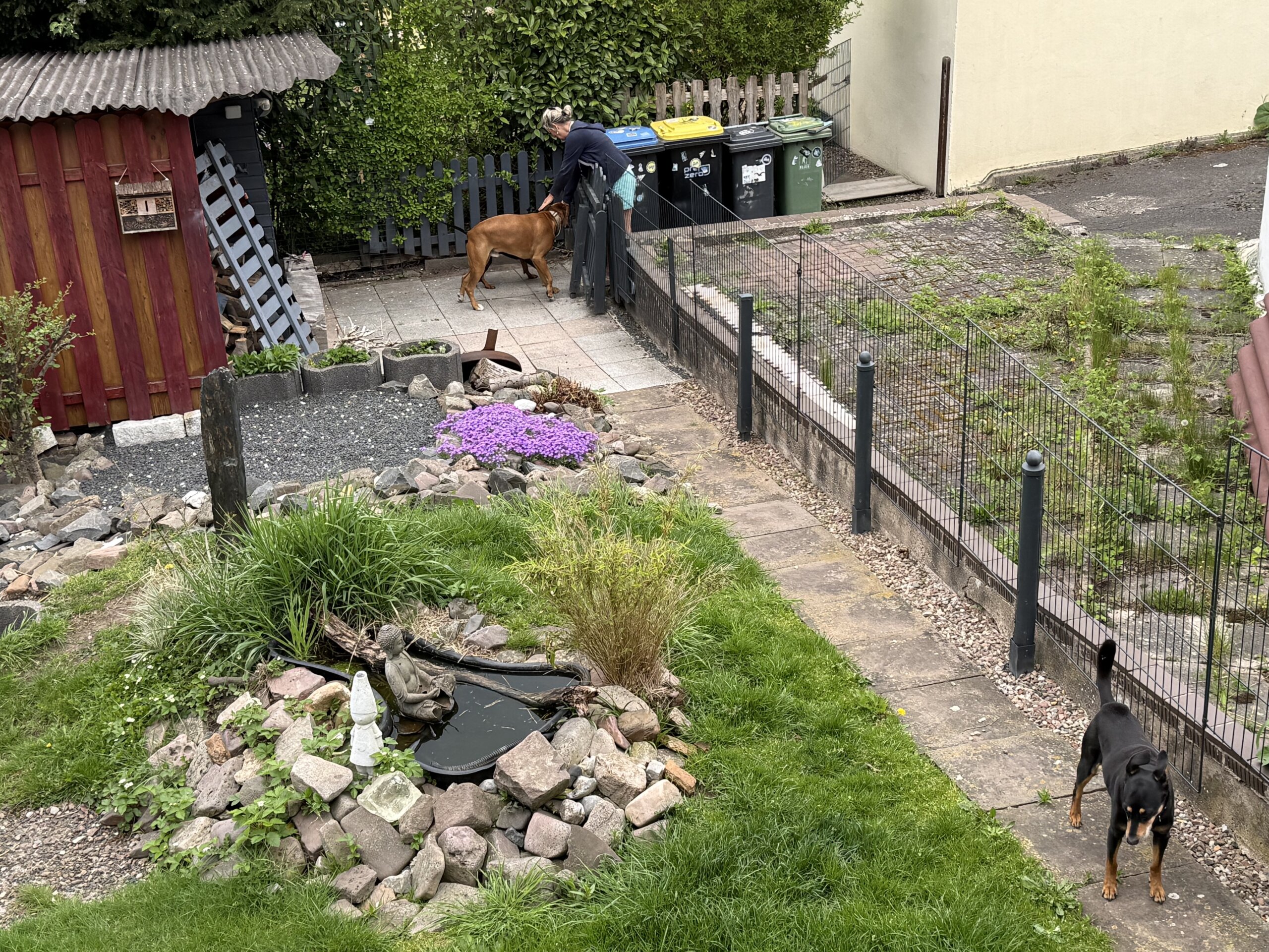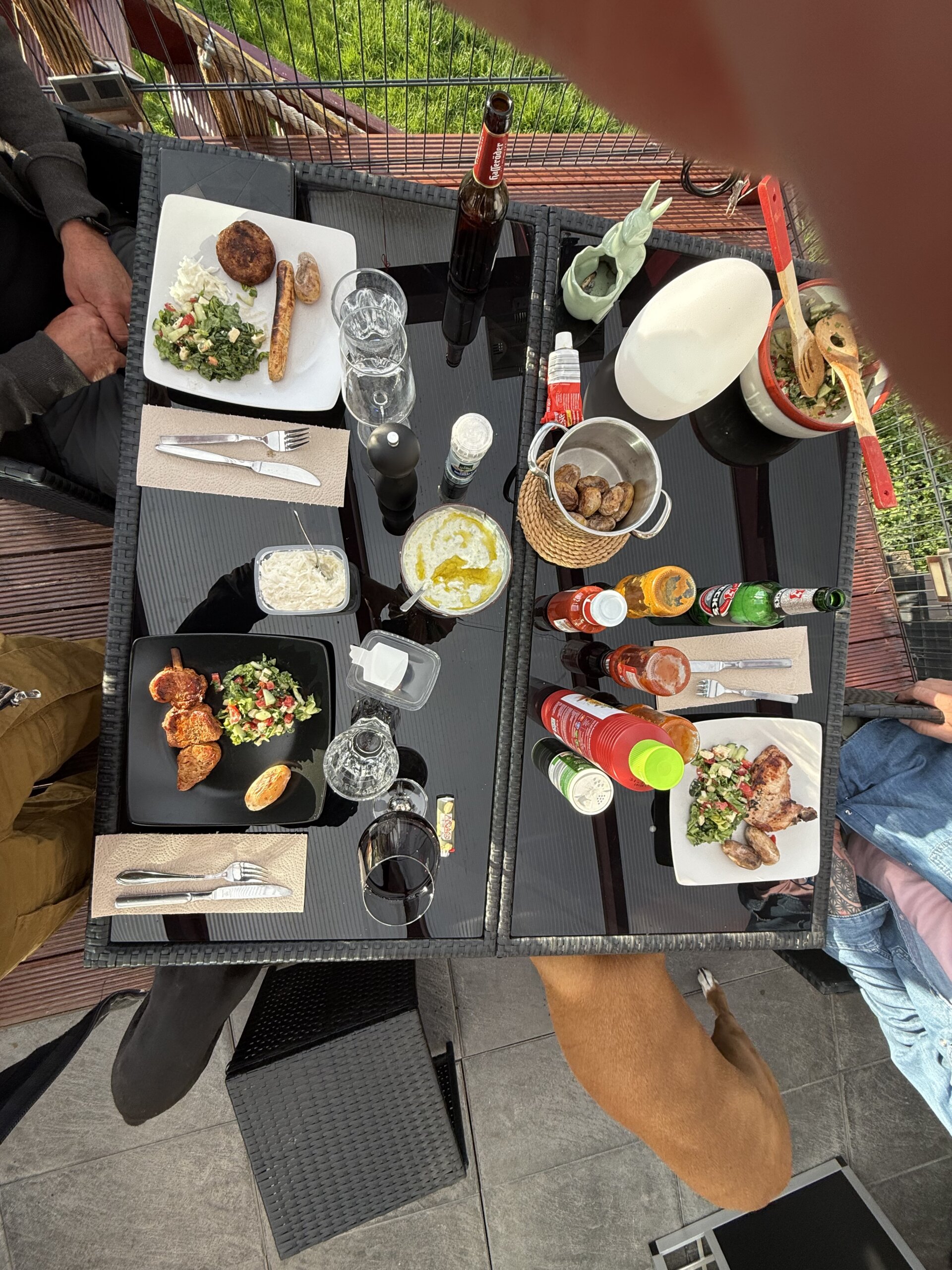 Zuhause beim Niels freuen sich die Hunde und die Menschen. Das Wetter ist noch richtig schön, wir können auf der Terrasse sitzen und später wird gegrillt. Der Hodgi wartet heute etwas einsam vor der Haustüre, doch Bo und Titus passen auf!