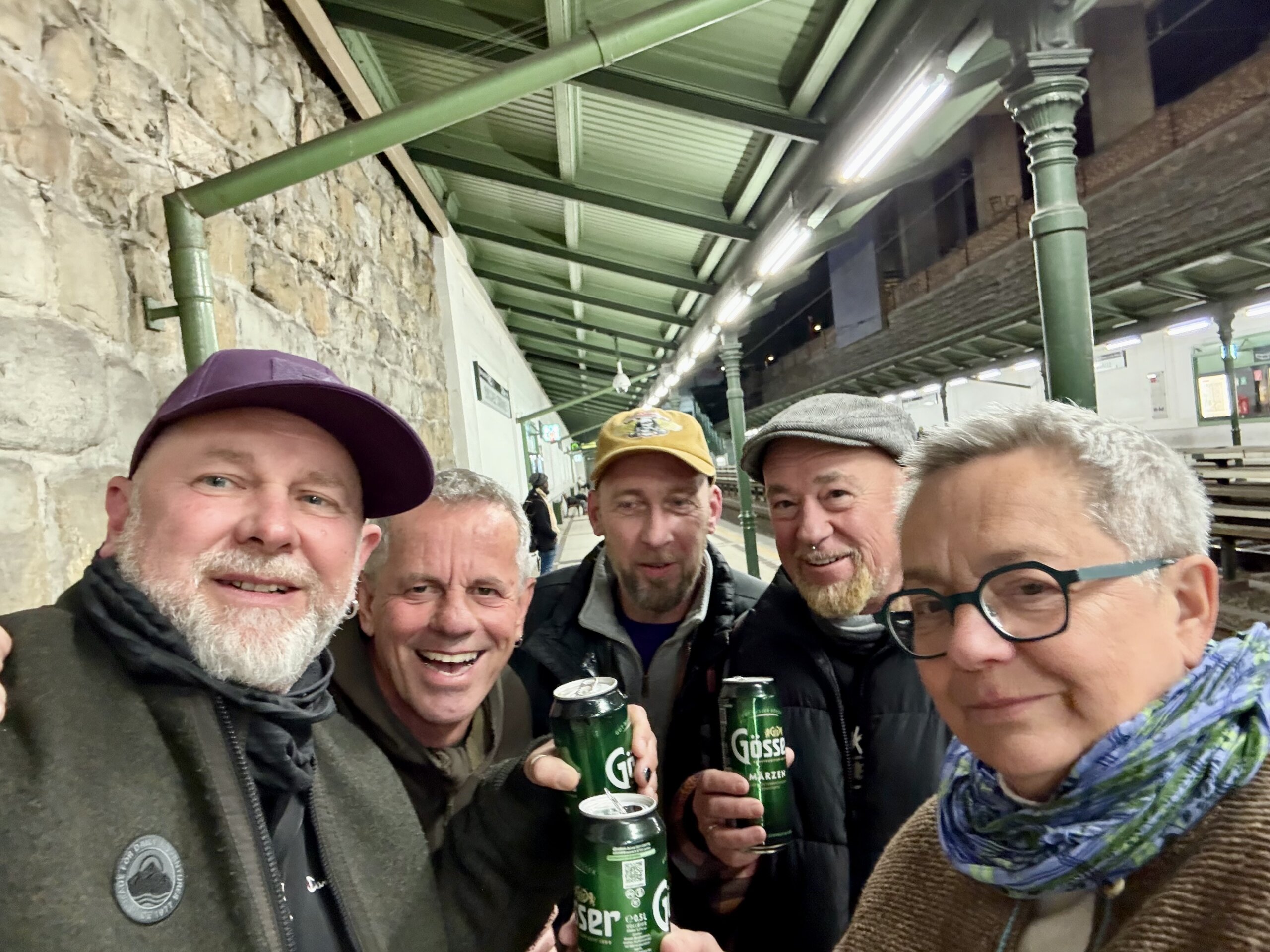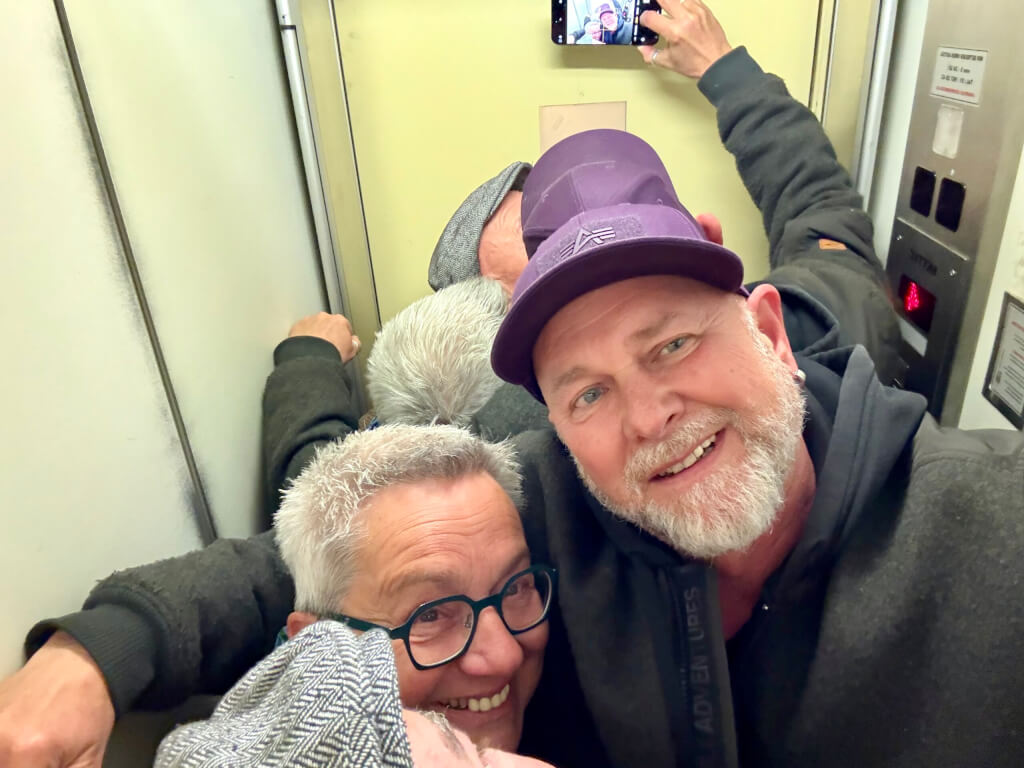 Unsere Freunde aus Bayern, Gerti und Michi waren schon da, ein schnelles Ankommensbier, Dann ging es los zu Tobi und Chris. Der Aufzug lädt zum Kuscheln ein.