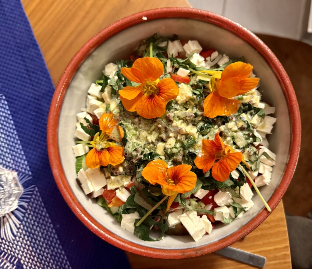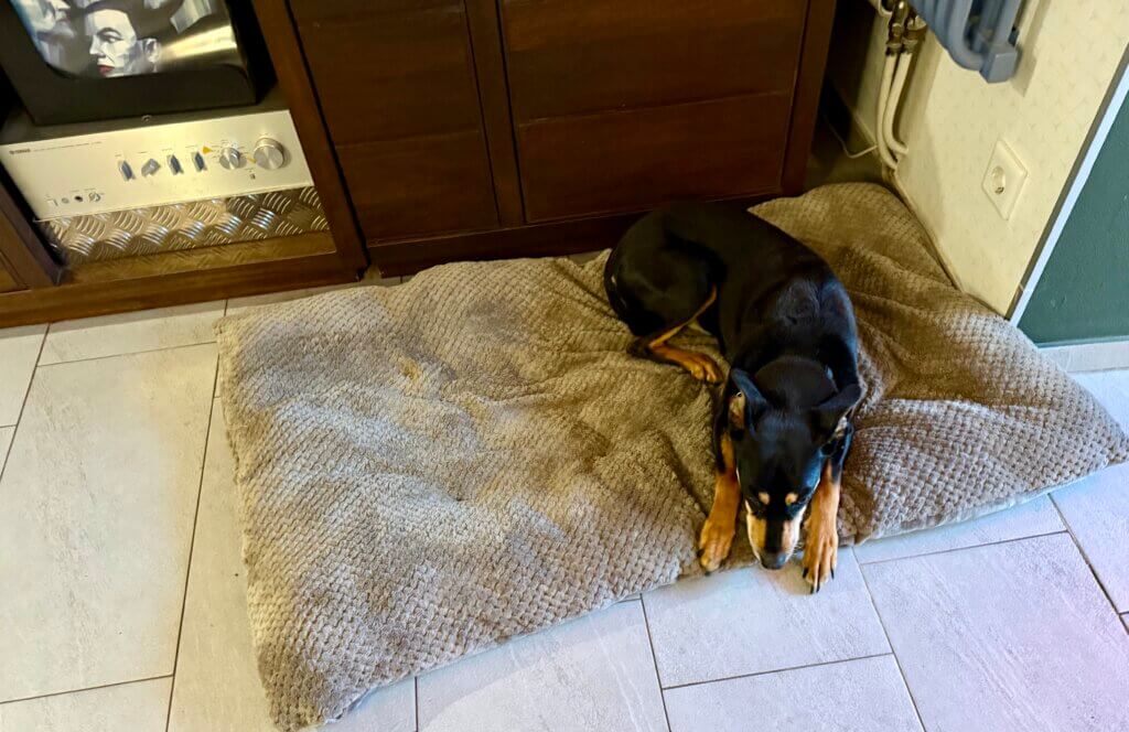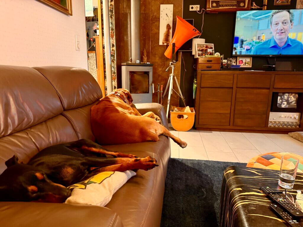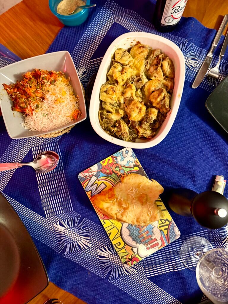 Wir bleiben zu Hause, denn auch kein Hund möchte vor die Türe. Es gibt ein rumfort Abendessen: Reste vom Inder, Frischer Salat, Nan, und einen Rest Champignon Tortellini Auflauf.