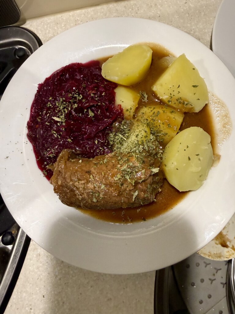 Rinderroulade( war vorbereitet) mit neu gekauften Kartoffeln und Rotkohl. Es musste mal was gutbürgerliches auf den Tisch.