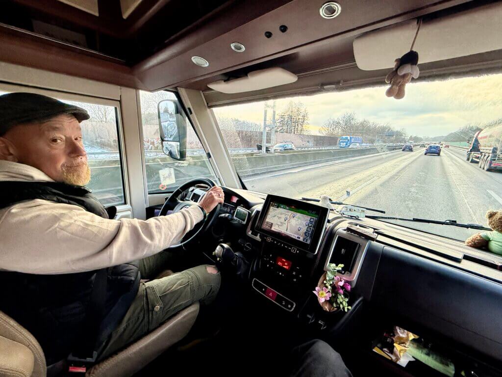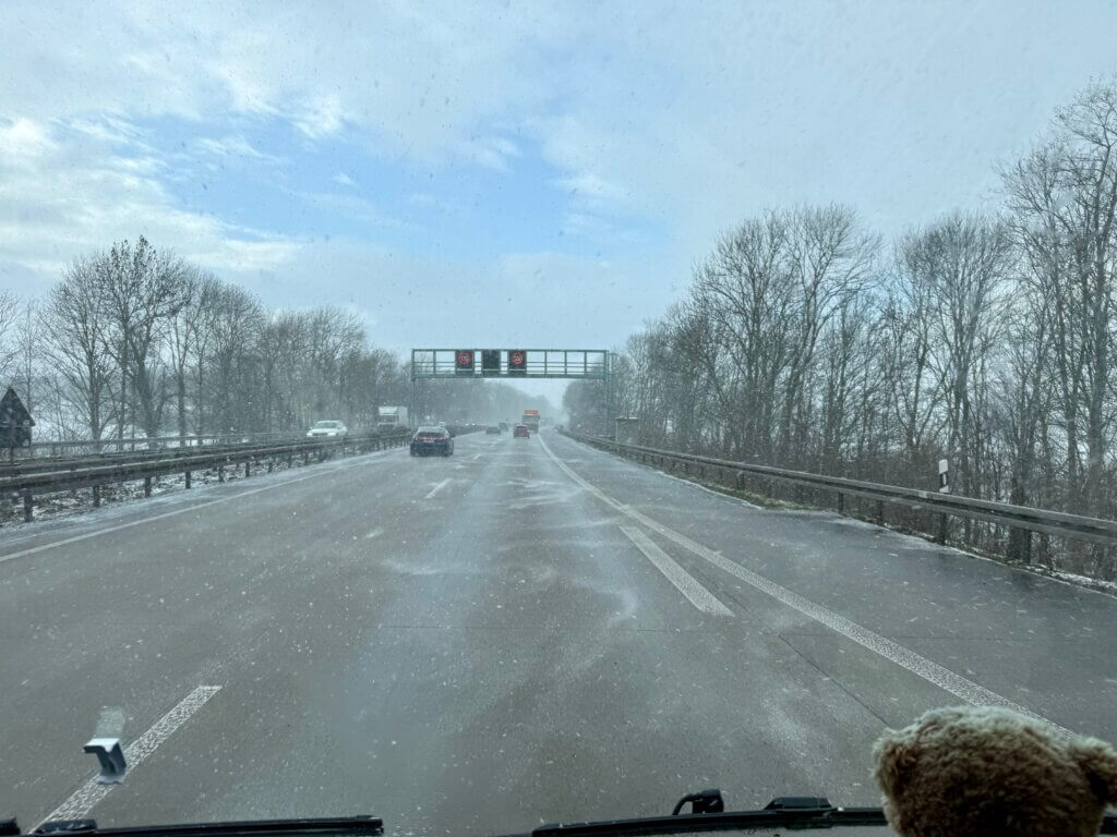 Unterwegs ein kurzes Schneegestöber und wenn nichts dazwischen kommt sind wir gleich in unserem zu Hause in Kaster.