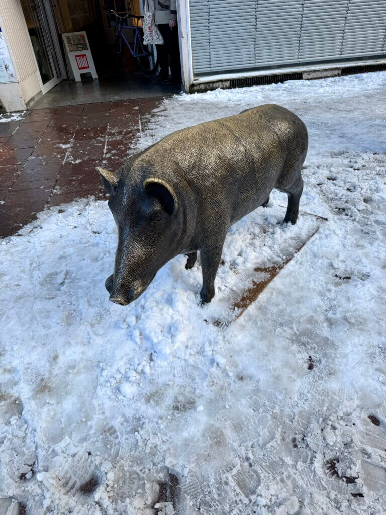 Das goldene Schwein in der Fußgängerzone ist hoffentlich ein Glücksschwein und möge uns sagen, dass wir morgen gut hier weg kommen…..wir werden sehen.
