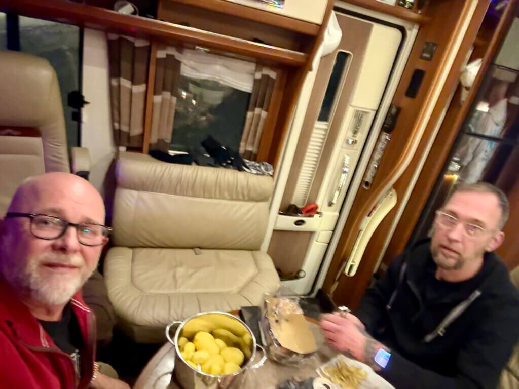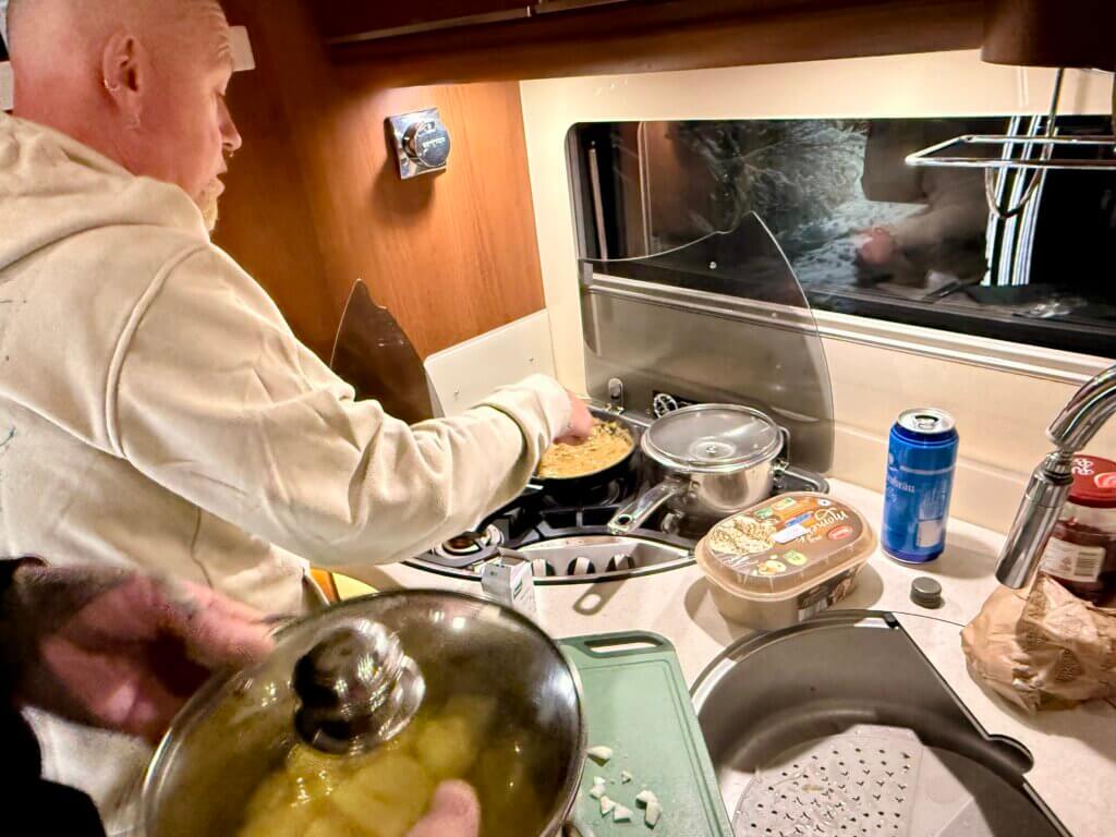 Am Abend werden die Lebensmittel verarbeitet, es entsteht ein sehr leckeres Abendessen: hausgemachte Ochsenbäckchen mit Rotkohl und Kartoffelstampf, dazu geröstete, karamellisierte Zwiebeln- gut war es!