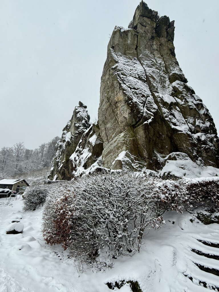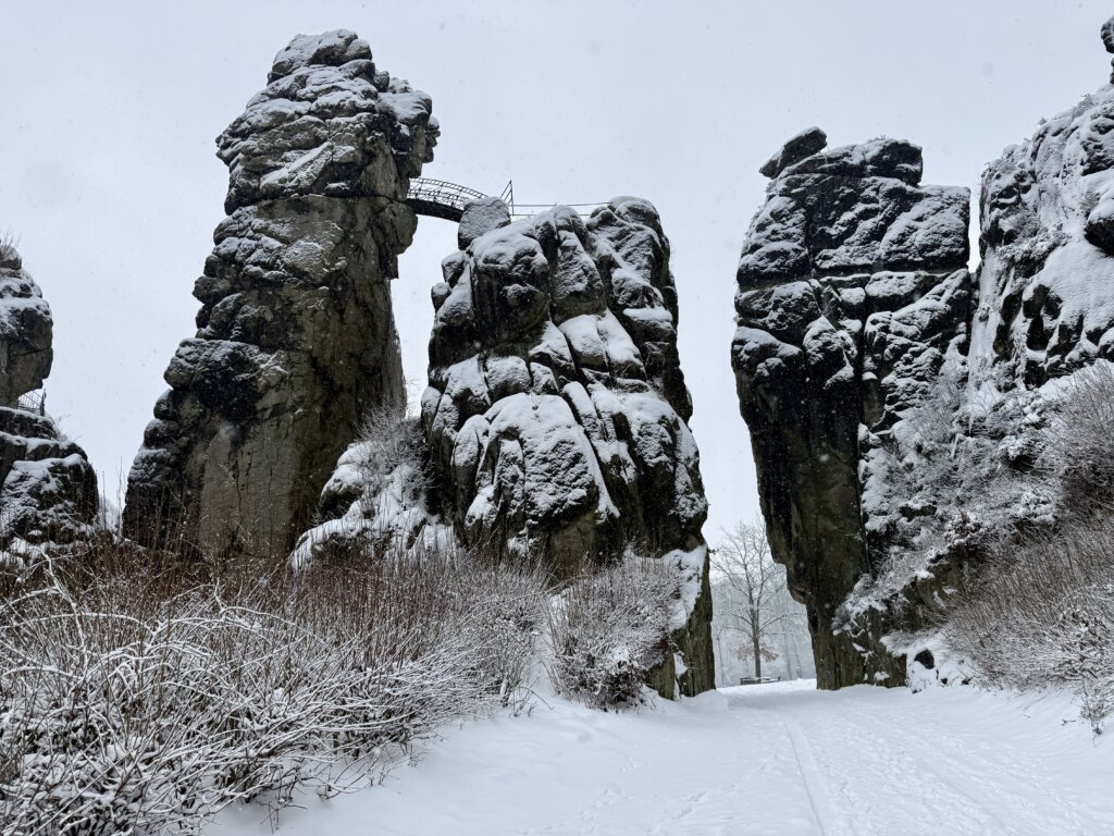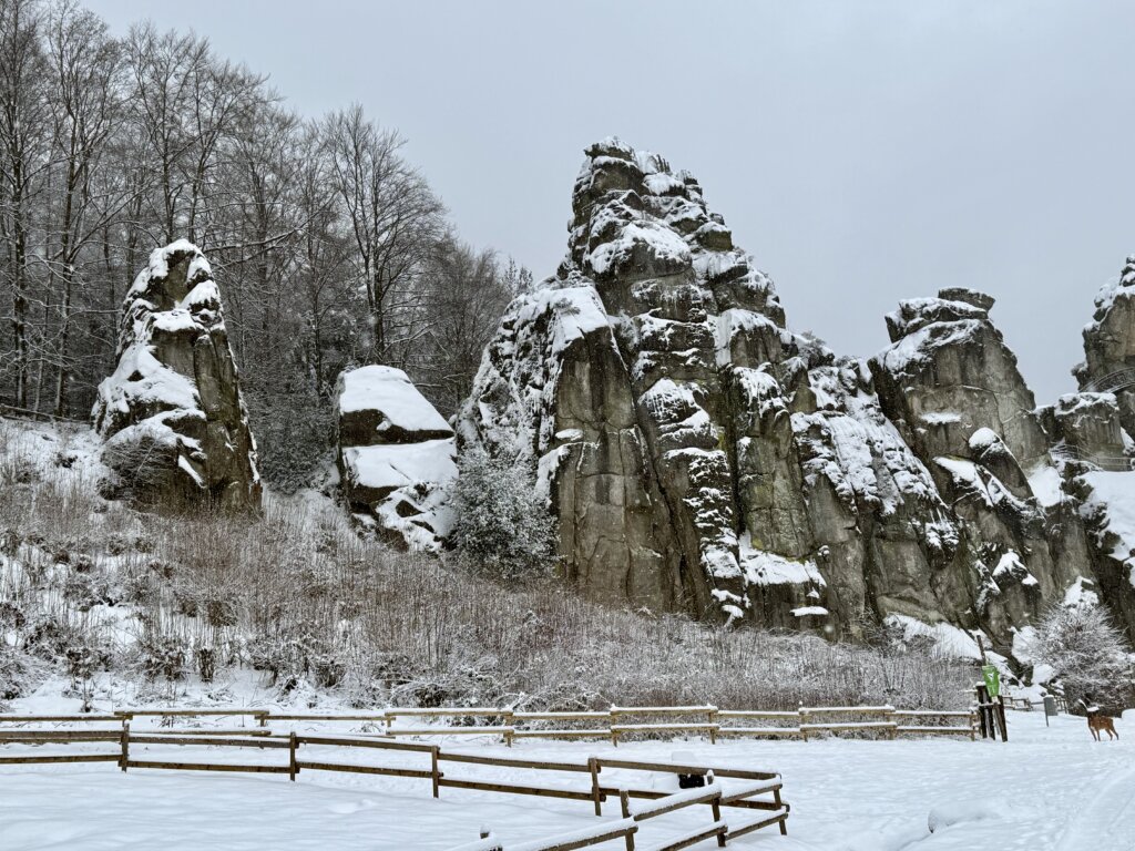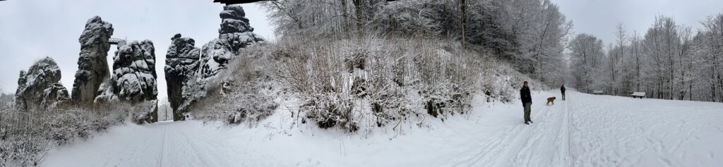 Nach dem Frühstück waren wir kurz im örtlichen Supermarkt, dann starten wir eine kleine Schneewanderung zu den Externsteinen eine bekannte, sehenswerte Felsformation.