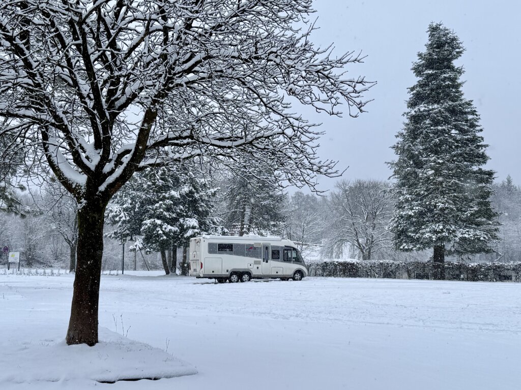 Wir sind ziemlich eingeschneit- wir bleiben stehen. Wenns sein muss hätten wir Schneeketten.