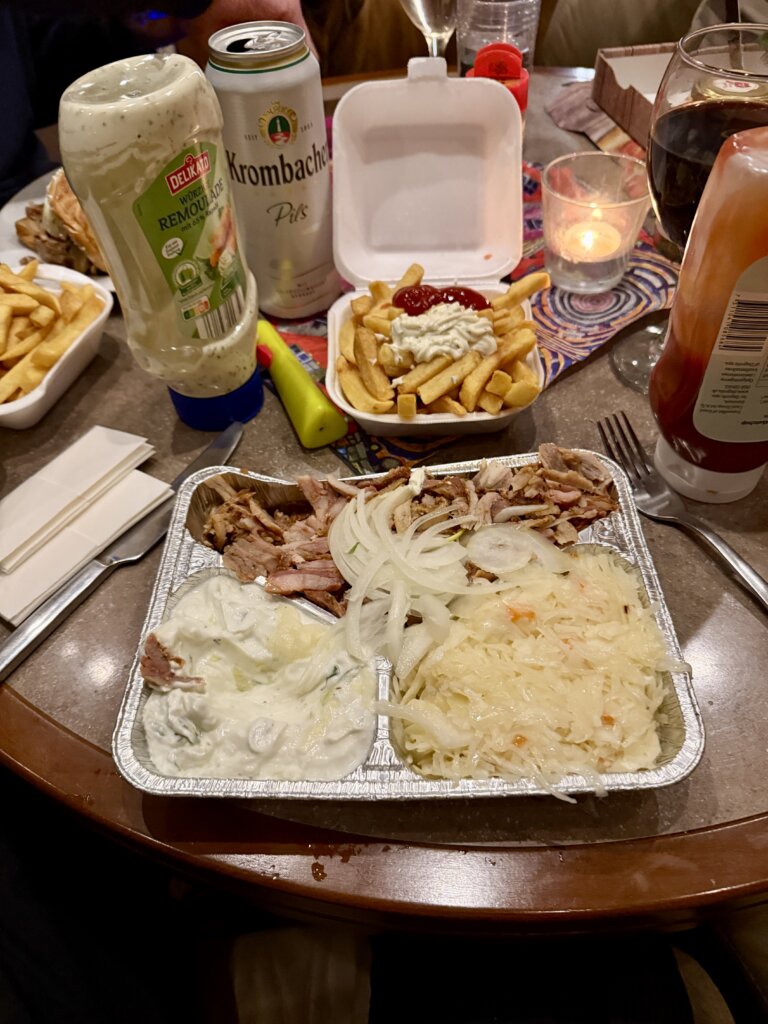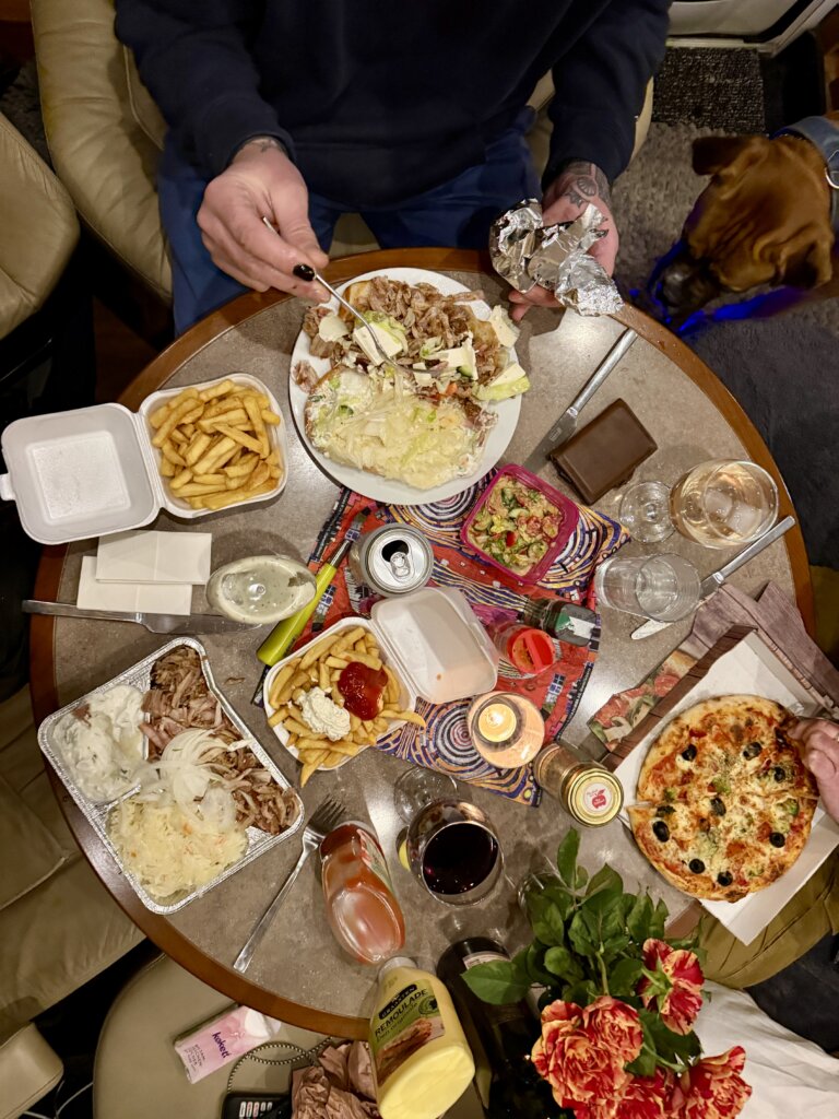 Was bleibt? Lieferando bringt uns Gyros und für Dirk Veggi Pizza ans Womo. Wartezeit von der Bestellung bis zur Lieferung waren 45 min, das Essen war lecker und auch noch warm. Fazit: kann man mal machen.