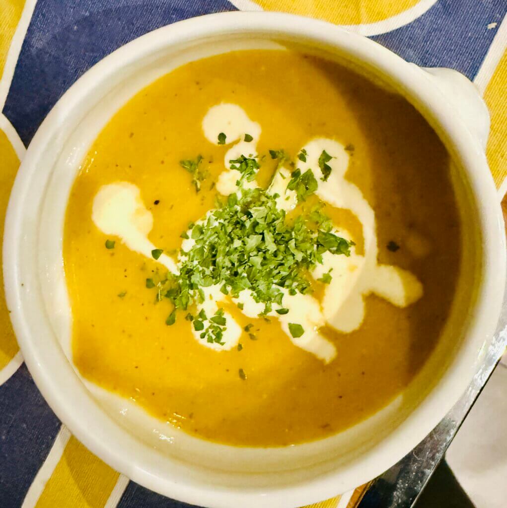Vorspeise: Rote Linsen Apfelcremesuppe.