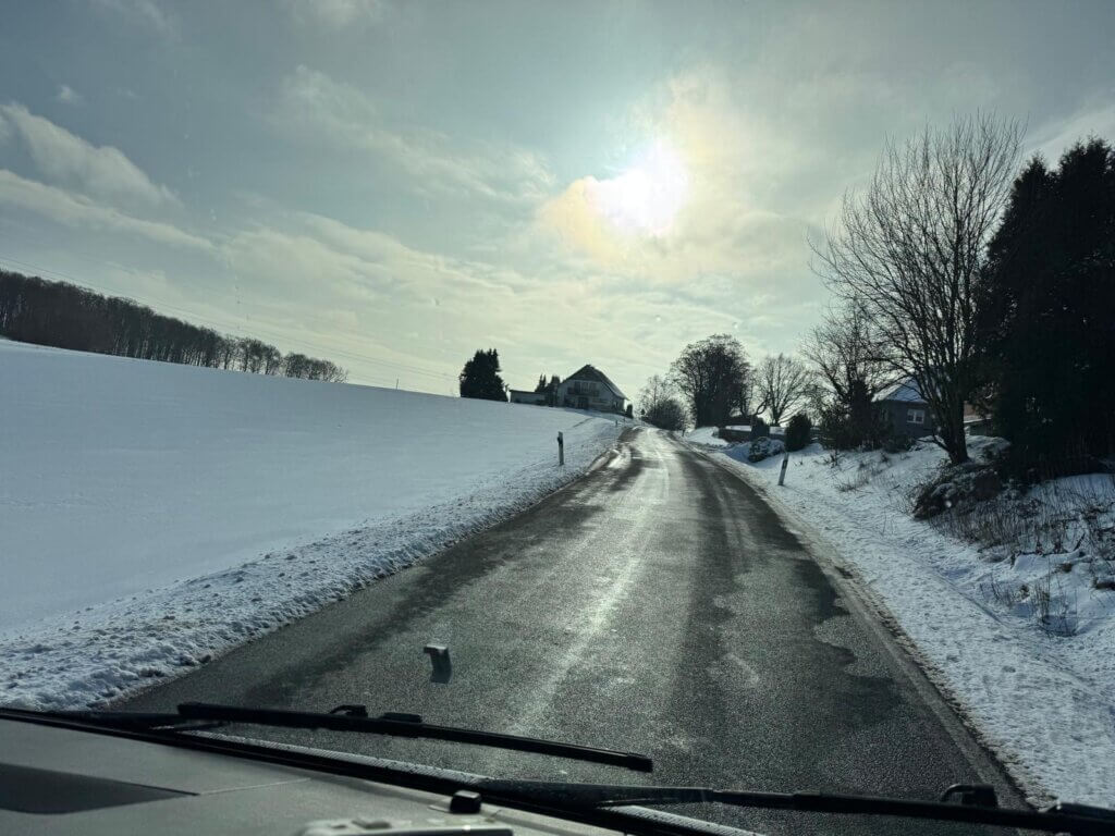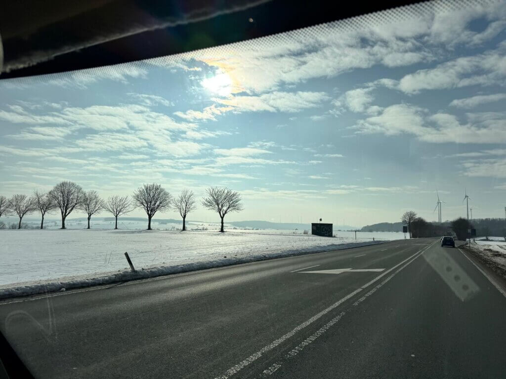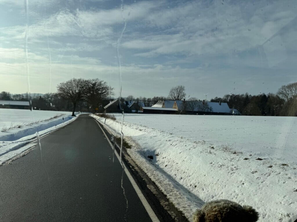 Von km zu km wird der Schnee weniger, dann ist er weg und in Kaster haben wir 10 Grad.