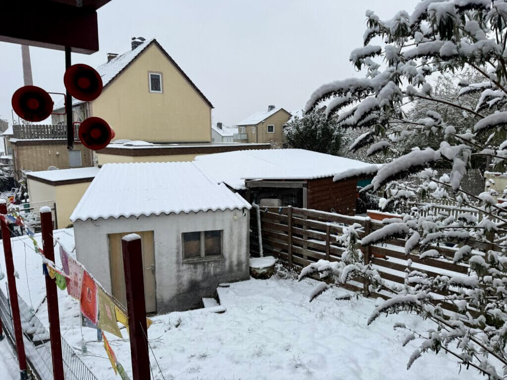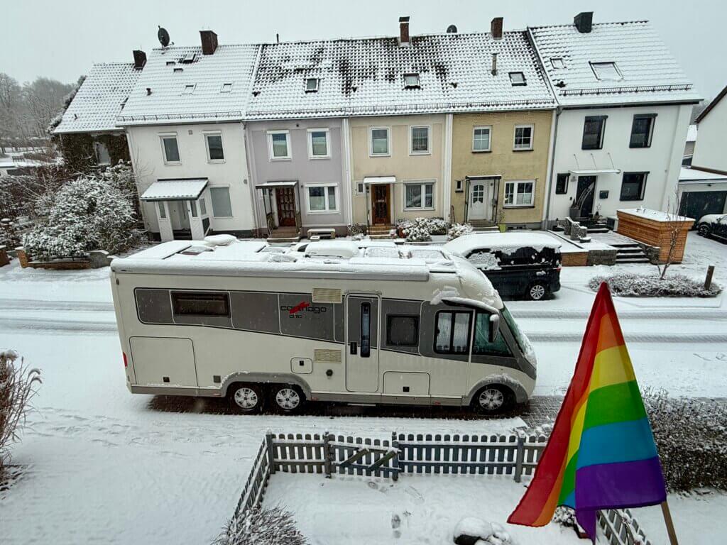 Zum Glück hat es gegen 9 Uhr aufgehört zu schneien und die Temperatur ging über 0 Grad. Wir sind dann irgendwann los gekommen und fahren durch das abklingende Schneegestöber bis hinter Paderborn, dann war’s vorbei, kein Schnee mehr!